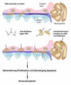 Außer der Haut kann die Krankheit auch andere Organsysteme befallen. Prognostisch ungünstig ist dabei eine Beteiligung der Nieren in Form einer sogenannten Glomerulonephritis (kurz Lupusnephritis), welche bei bis zu 55% der Patienten mit SLE auftritt.[2] Dafür verantwortlich gemacht werden Auto-Antikörper gegen doppelsträngige DNA, welche sich in den Nieren ablagern und dort eine Entzündungsreaktion hervorrufen.[3] Wie es zur Entstehung von Antikörpern gegen doppelsträngige DNA kommt, ist unklar und seit vielen Jahren Gegenstand intensiver Forschung. Wir wissen nur, dass diese Auto-Antikörper durch das körpereigene Immunsystem produziert werden.