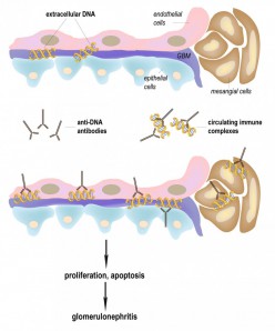 The pathogenesis of lupus nephritis (i.e. why and how lupus nephritis develops) has been the subject of intense research for many years. It is believed that auto-antibodies directed against double-stranded DNA accumulate in the kidneys where they trigger a fatal inflammatory reaction (Figure 2).[5] However, which mechanisms lead to the generation of detrimental SLE auto-antibodies is still unclear. What is known is only that these auto-antibodies are produced by the body’s own immune system.